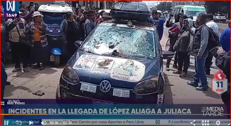 La emisora informó que el ambiente tenso se agravó cuando un grupo de manifestantes lanzó basura, estiércol y barro a un automóvil identificado con afiches de Yanet Quispe, candidata a diputada por Puno de Renovación Popular.